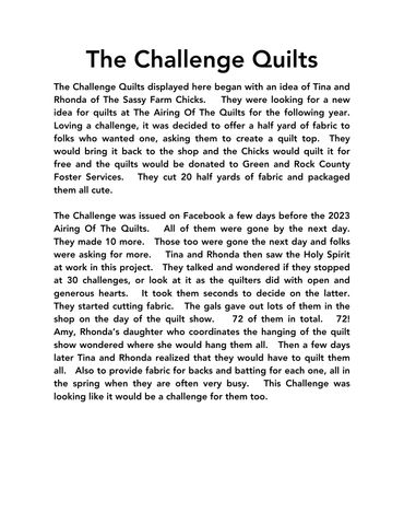 We'll hang quilts outdoors to air in Downtown Orfordville. They'll go down the street and around the corner, and in Purdy Park! The fabulous Challenge Quilts will be displayed around the Purdy Park Pavilion - always a wonderful collection of quilter's generosity. Come and see the amazing works of quilted art.