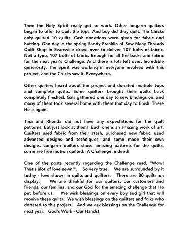 The Chicks are longarm quilters that enjoy all aspects of quilting - both edge to edge and custom designs. Together they share many years of sewing and quilting experience, and have been longarm quilting professionally on a Gammill Statler Stitcher named Mrs. McDonald since 2013. We offer an increasing amount of quilting fabrics, patterns, quilting notions and tools, and quilt kits for sale.