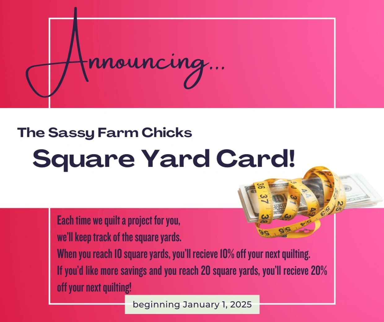 We figure the quilting area of your top by square yards. Mostly because it's easier to envision square yards than square inches. We'll keep a card for each quilter and keep track of the square yards of quilting from quilt to quilt. When 10 square yards is reached, you may choose to take 10% off the quilting cost of your next project. If you prefer to wait til 20 square yards is reached, then you can receive 20% off the quilting cost of the next project. Then we'll start again for the next discount!